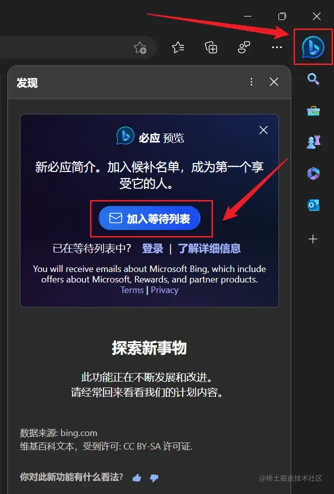 完装完成后,点击右边上角必应图标,会弹出申请按钮,登录账号加入等待列表